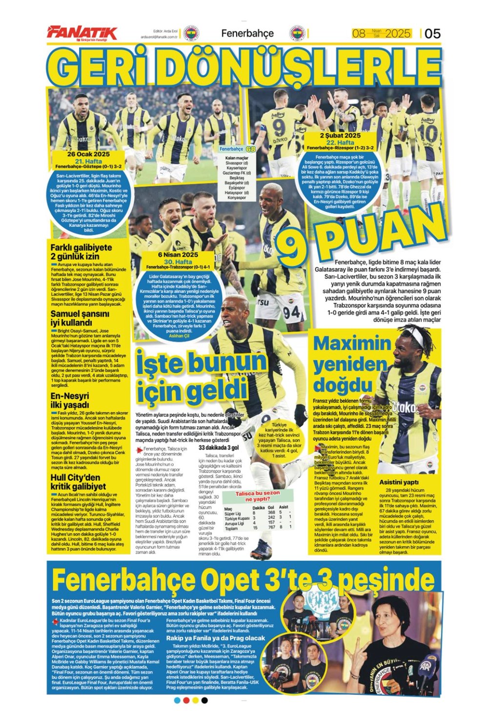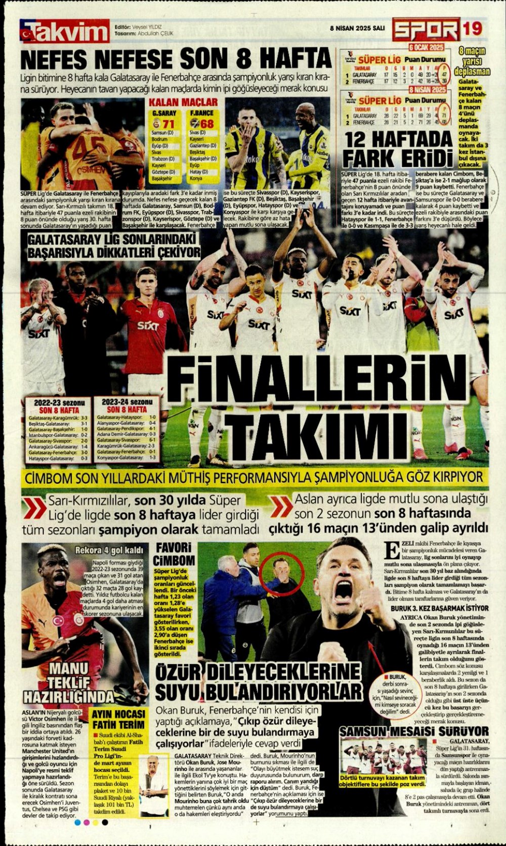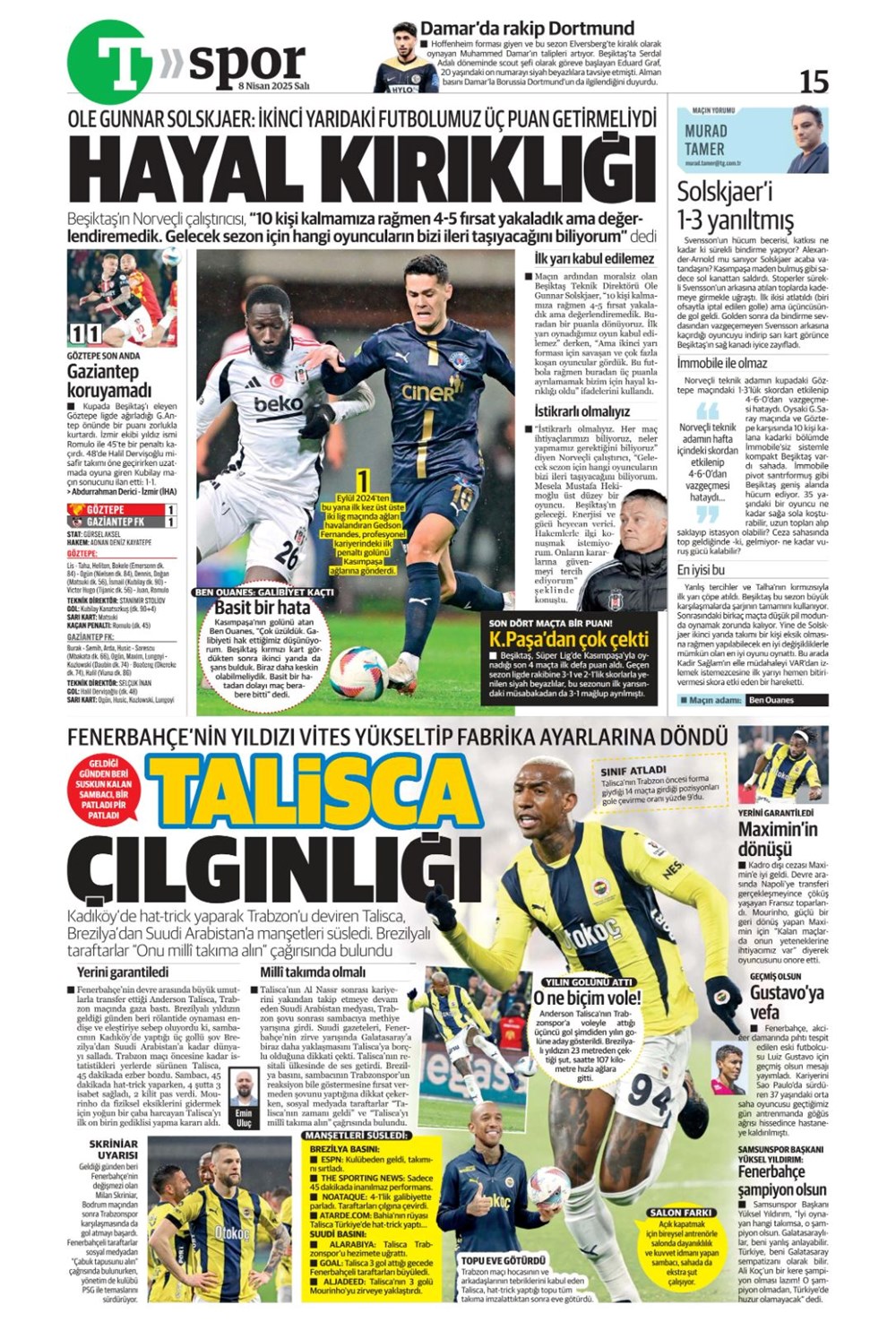 SPOR“Kartal düşük irtifada” (8 Nisan 2025 spor manşetleri) Son güncelleme: Nisan 8, 2025 10:36 am Yayımlandı: Nisan 8, 2025 Paylaş 0 Dakika Okuma Paylaş Antalyaspor-Samsunspor Derbisi: Saat Kaçta, Hangi Kanalda Yayınlanacak? Samsunspor, Schindler ile yollarını ayırdı Aslan mı Yoksa Akrep mi Gülecek: Galatasaray – Antalyaspor Mücadelesi! Fenerbahçe’nin yeni transferi Asensio İstanbul’da Arsenal duyurdu: Myles Lewis-Skelly’nin kontratı uzatıldı Bu Makaleyi Paylaş Facebook Bağlantıyı Kopyala Yazdır Paylaş Önceki Makale Belediye liderini ve müdafaasını öldüren sanık: Yalnızca ayaklarına ateş ettim Sonraki Makale Ankara’da kaçakçılık operasyonu: 100 tabanca ele geçirildi Yorum yapılmamış Yorum yapılmamış Bir yanıt yazın Yanıtı iptal etE-posta adresiniz yayınlanmayacak. Gerekli alanlar * ile işaretlenmişlerdirYorum *Ad * E-posta * İnternet sitesi Daha sonraki yorumlarımda kullanılması için adım, e-posta adresim ve site adresim bu tarayıcıya kaydedilsin. Takip EdinXTakip EtInstagramTakip EtTelegramTakip Et - Reklam -Son Haberler Ferdi Zeyrek davasında 10 sanık hakim karşısında GÜNDEM Aralık 5, 2025 Altın fiyatları güne böyle başladı EKONOMİ Aralık 5, 2025 Düzmece banka reklamlarıyla dolandırıcılık. 18 kuşkulu yakalandı GÜNDEM Aralık 5, 2025 33 vilayetteki DAEŞ operasyonunda 51 tutuklama GÜNDEM Aralık 5, 2025