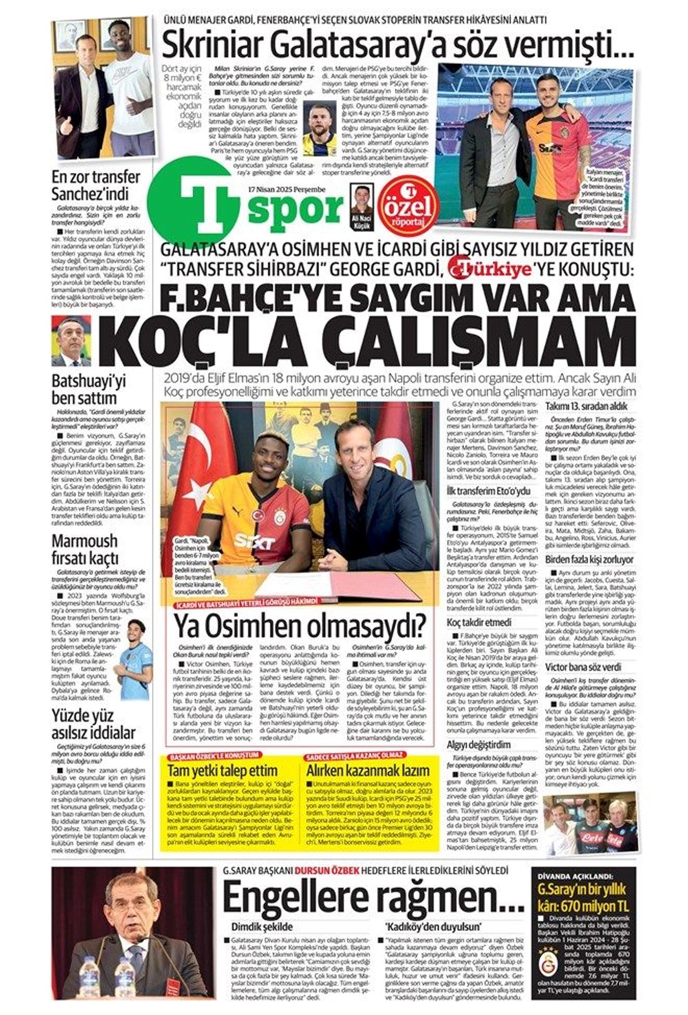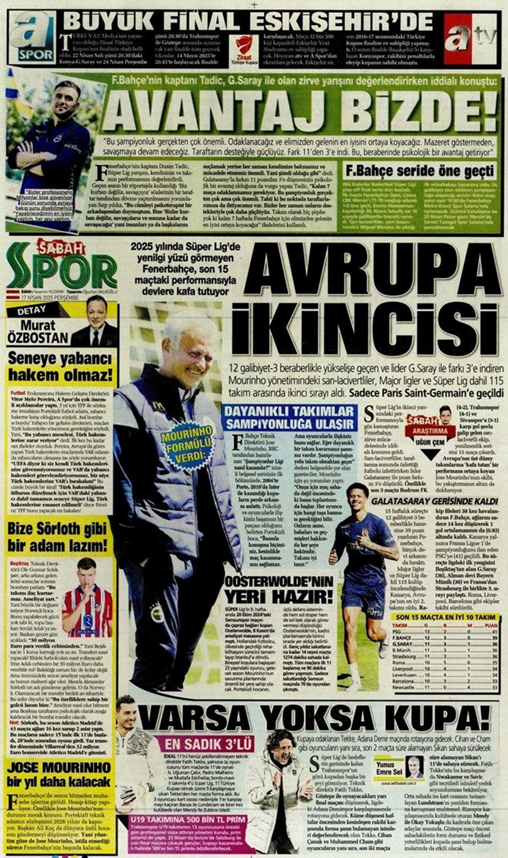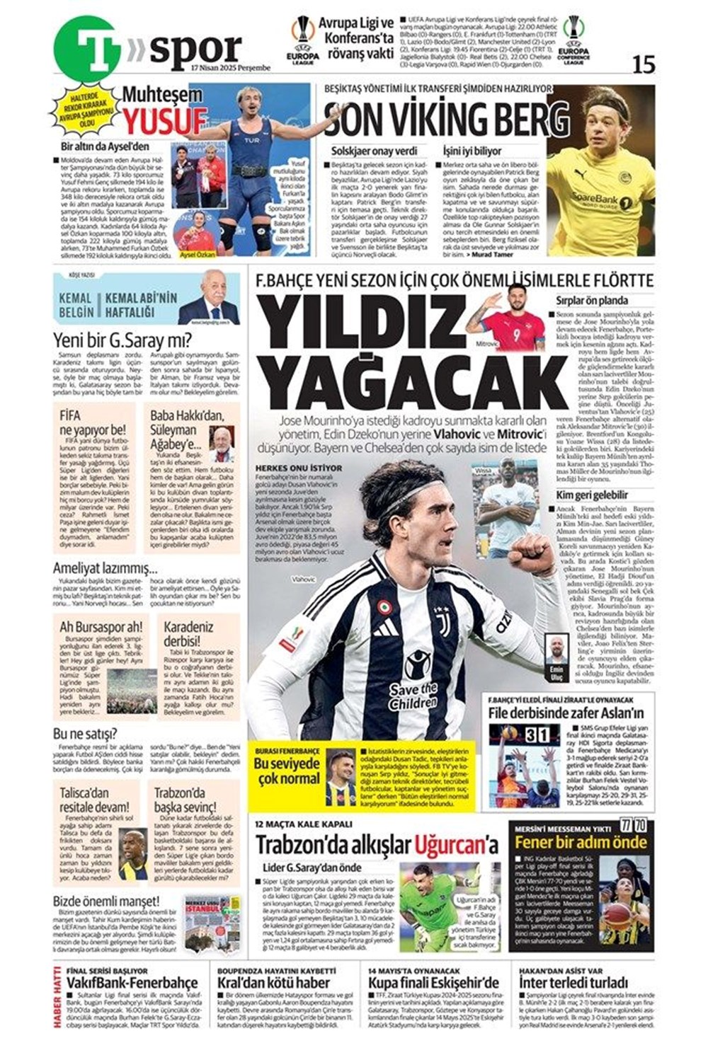 SPOR“Fener’den Chiesa bombası” (17 Nisan 2025 spor manşetleri) Son güncelleme: Nisan 17, 2025 12:11 pm Yayımlandı: Nisan 17, 2025 Paylaş 0 Dakika Okuma Paylaş Allan Saint-Maximin’den Fenerbahçe savı: Bana doping yapmaya kalktılar 2025 Voleybol Milletler Ligi (VNL) maçları ne vakit? İşte Filenin Sultanları maç tarihleri Dursun Özbek’ten Cumhurbaşkanı Erdoğan’a teşekkür UEFA Şampiyonlar Ligi’nde 2. eleme turu başlıyor: İşte ilk maçlar Şahika Ercümen’den 4 altın madalya Bu Makaleyi Paylaş Facebook Bağlantıyı Kopyala Yazdır Paylaş Önceki Makale 17 Nisan ne günü? Köy Enstitüleri’nin kuruluş yıl dönümü Sonraki Makale Aaron Boupendza’nın kuşkulu mevti sonrası açıklama geldi: Cinayet kuşkusu var mı? Yorum yapılmamış Yorum yapılmamış Bir yanıt yazın Yanıtı iptal etE-posta adresiniz yayınlanmayacak. Gerekli alanlar * ile işaretlenmişlerdirYorum *Ad * E-posta * İnternet sitesi Daha sonraki yorumlarımda kullanılması için adım, e-posta adresim ve site adresim bu tarayıcıya kaydedilsin. Takip EdinXTakip EtInstagramTakip EtTelegramTakip Et - Reklam -Son Haberler 5 yeni beldede seçim yapılacak GÜNDEM Aralık 6, 2025 Meteoroloji’den 8 ile sarı ve turuncu ikaz GÜNDEM Aralık 6, 2025 Tıra arttan çarpan araçta 2 kişi öldü GÜNDEM Aralık 6, 2025 NASA’dan derin uzayın fotoğrafı: KX Andromedae TEKNOLOJİ Aralık 6, 2025