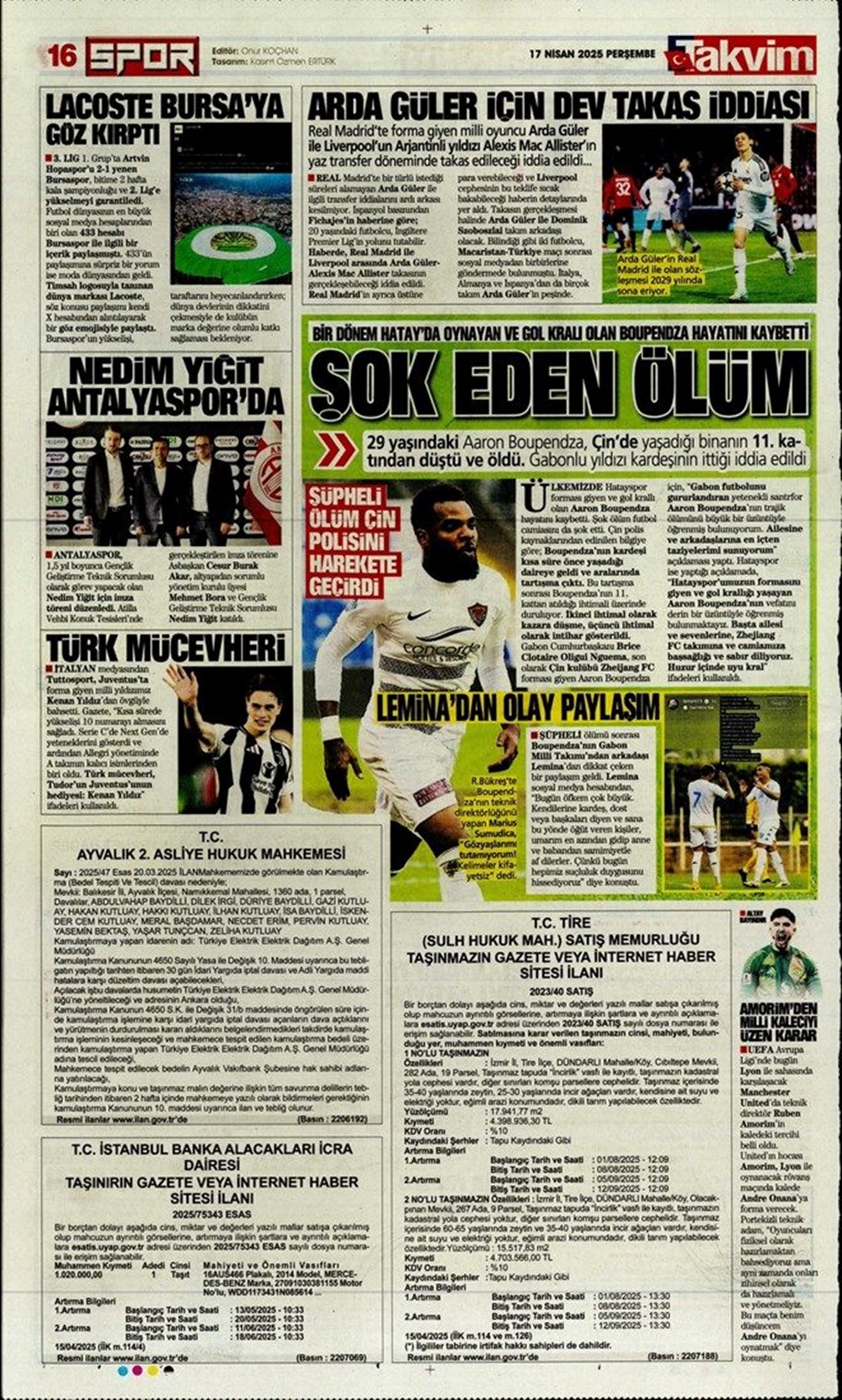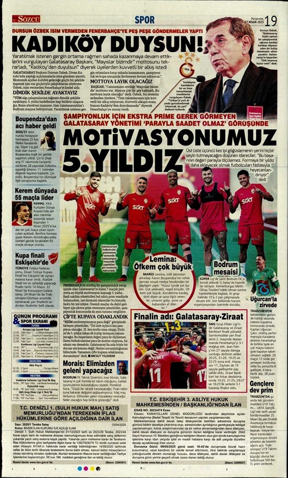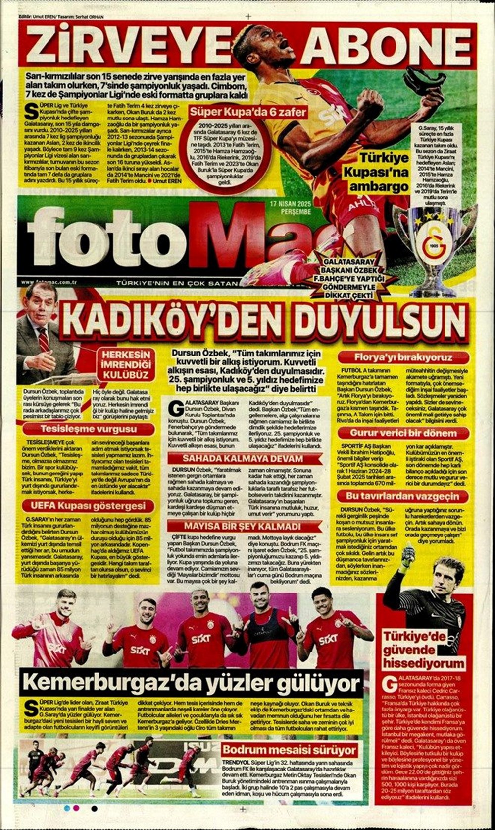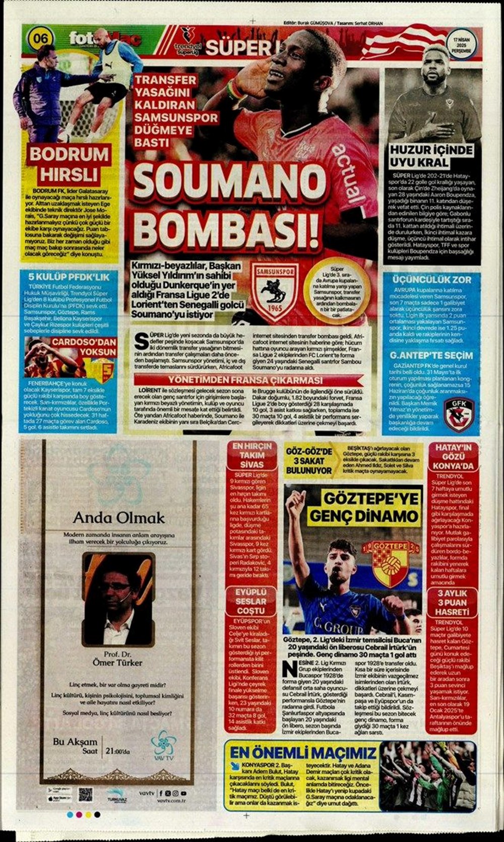 SPOR“Fener’den Chiesa bombası” (17 Nisan 2025 spor manşetleri) Son güncelleme: Nisan 17, 2025 12:11 pm Yayımlandı: Nisan 17, 2025 Paylaş 0 Dakika Okuma Paylaş Allan Saint-Maximin’den Fenerbahçe savı: Bana doping yapmaya kalktılar 2025 Voleybol Milletler Ligi (VNL) maçları ne vakit? İşte Filenin Sultanları maç tarihleri Dursun Özbek’ten Cumhurbaşkanı Erdoğan’a teşekkür UEFA Şampiyonlar Ligi’nde 2. eleme turu başlıyor: İşte ilk maçlar Şahika Ercümen’den 4 altın madalya Bu Makaleyi Paylaş Facebook Bağlantıyı Kopyala Yazdır Paylaş Önceki Makale 17 Nisan ne günü? Köy Enstitüleri’nin kuruluş yıl dönümü Sonraki Makale Aaron Boupendza’nın kuşkulu mevti sonrası açıklama geldi: Cinayet kuşkusu var mı? Yorum yapılmamış Yorum yapılmamış Bir yanıt yazın Yanıtı iptal etE-posta adresiniz yayınlanmayacak. Gerekli alanlar * ile işaretlenmişlerdirYorum *Ad * E-posta * İnternet sitesi Daha sonraki yorumlarımda kullanılması için adım, e-posta adresim ve site adresim bu tarayıcıya kaydedilsin. Takip EdinXTakip EtInstagramTakip EtTelegramTakip Et - Reklam -Son Haberler 5 yeni beldede seçim yapılacak GÜNDEM Aralık 6, 2025 Meteoroloji’den 8 ile sarı ve turuncu ikaz GÜNDEM Aralık 6, 2025 Tıra arttan çarpan araçta 2 kişi öldü GÜNDEM Aralık 6, 2025 NASA’dan derin uzayın fotoğrafı: KX Andromedae TEKNOLOJİ Aralık 6, 2025