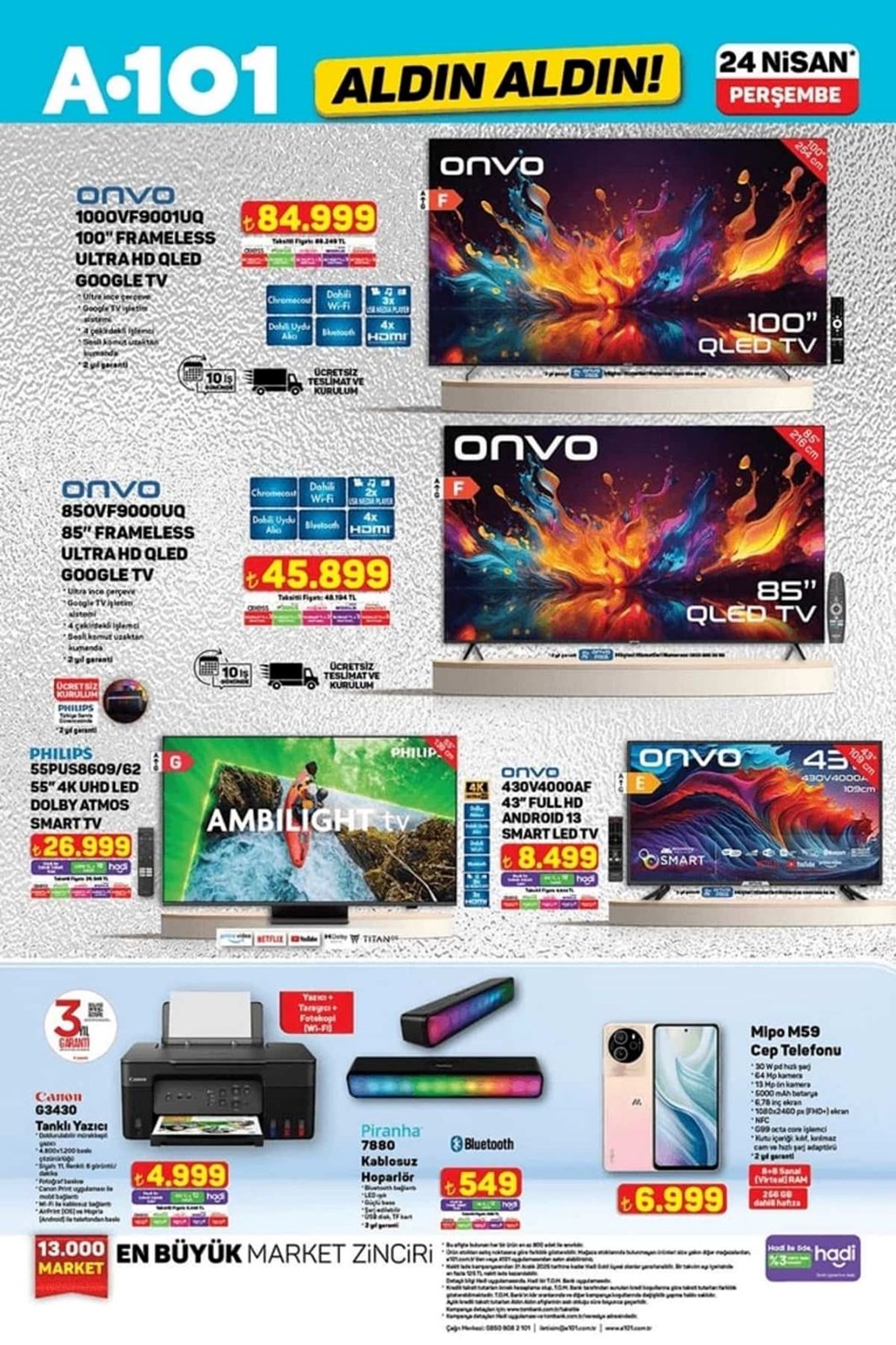A101’de kampanyalı eserler reyonlarda müşterileri bekleyecek. 4 farklı televizyon çeşidi zincir markete satışa sunulacak. 100, 85, 55, 43 İnç TV’ler 8.499 TL ile 84.999 TL ortasında raflarda olacak. Elektronik konut eşyalarından olan çay makinesi 1.399 TL, Çelik Kettle 649 TL, Çıkarılabilir Plakalı Tost Makinesi 1.799 TL, El Blender Seti 1.799 TL olacak. Şarjlı Dik Süpürge 3999 TL, 500 Watt Süpürge 1.549 TL, Saç Kurutma Makinesi 559 TL, Dijital Baskül 239 TL olacak. Alternatif olarak valiz çeşitleri, 4+1 merdiven, buzdolabı, çamaşır makinesi, bulaşık makinesi satışa sunulacak. İşte, A101 24 Nisan aktüel kataloğu ve fiyat listesi…