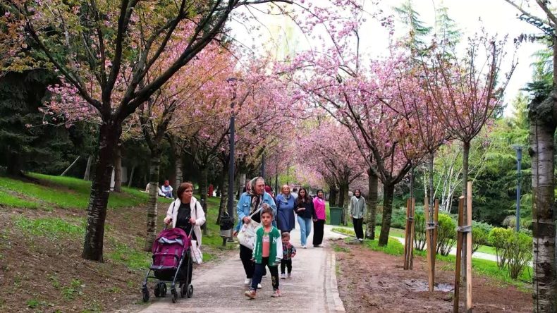 Dikmen Vadisi’ne gelen ziyaretçiler, baharın müjdecisi sayılan sakura ağaçlarının oluşturduğu pembe ve beyaz renkteki çiçek örtüsünün altında yürüyüş yaptı, bol bol fotoğraf çektirdi.