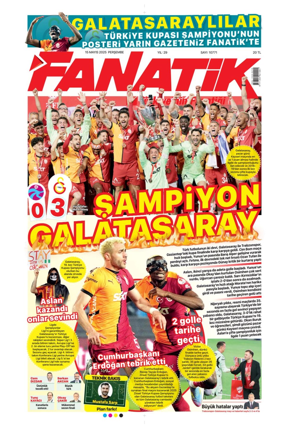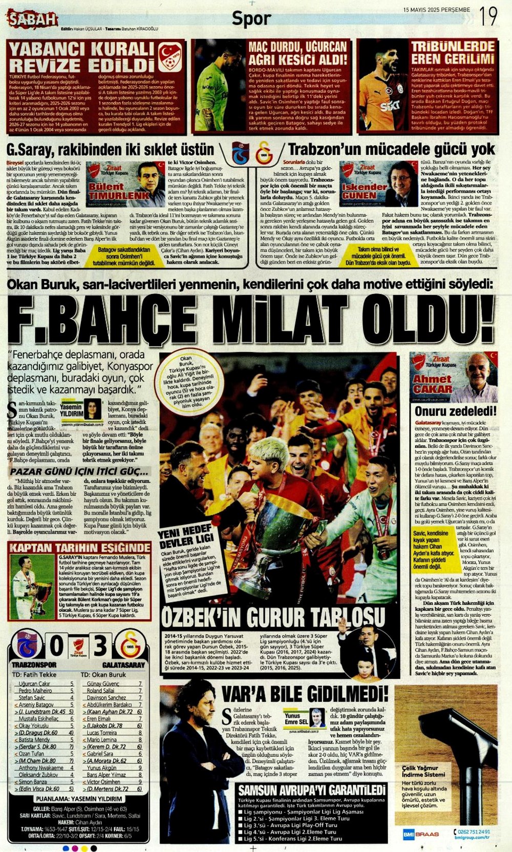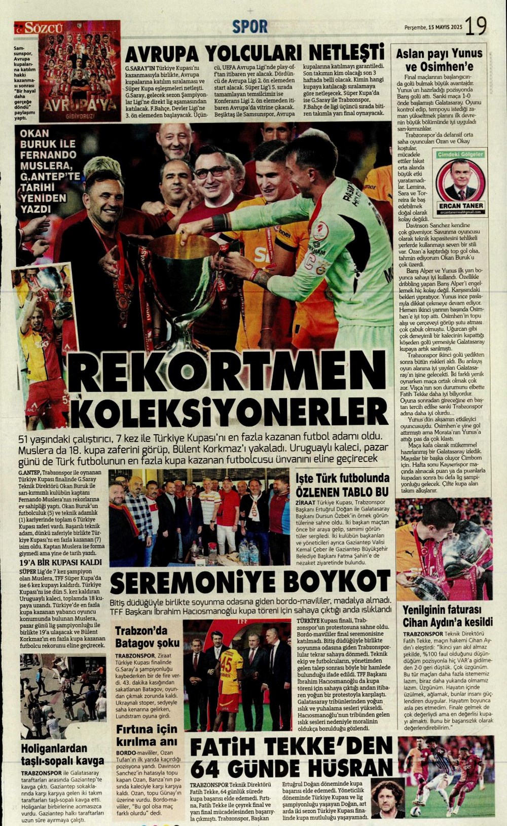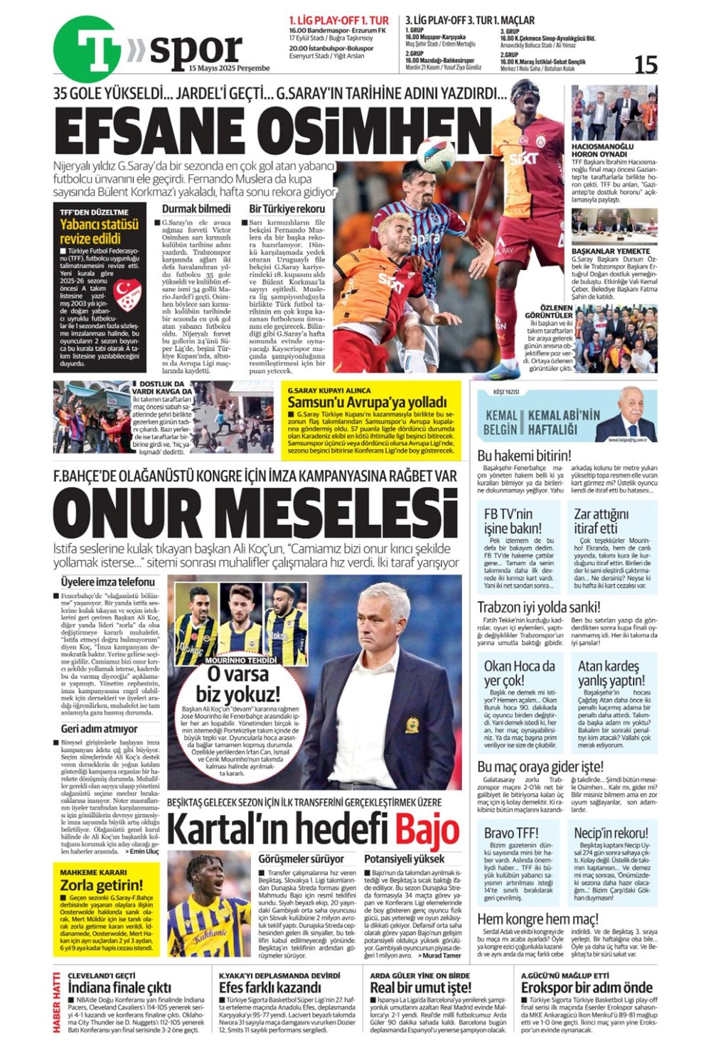 SPOR“Kupa canavarı Galatasaray” (15 Mayıs 2025 spor manşetleri) Son güncelleme: Mayıs 15, 2025 5:59 am Yayımlandı: Mayıs 15, 2025 Paylaş 0 Dakika Okuma Paylaş Gaziantep FK’nin Galibiyet Serisi Duvara Çarptı! 20. Dünya Atletizm Şampiyonası başladı Jose Mourinho savları günden güne artıyor: Fenerbahçe sonrası çalıştıracağı grubu duyurdu Bodrum FK, Galatasaray karşısında birinci peşinde Brezilya’dan Ayrılık Kararı ve Fenerbahçe’yi Hatırlatan Jorge Jesus Rüzgarı Bu Makaleyi Paylaş Facebook Bağlantıyı Kopyala Yazdır Paylaş Önceki Makale Samsunspor, 27 yıl sonra Avrupa kupalarına katılıyor Sonraki Makale Kastamonu’da korkunç zincirleme kaza! Yorum yapılmamış Yorum yapılmamış Bir yanıt yazın Yanıtı iptal etE-posta adresiniz yayınlanmayacak. Gerekli alanlar * ile işaretlenmişlerdirYorum *Ad * E-posta * İnternet sitesi Daha sonraki yorumlarımda kullanılması için adım, e-posta adresim ve site adresim bu tarayıcıya kaydedilsin. Takip EdinXTakip EtInstagramTakip EtTelegramTakip Et - Reklam -Son Haberler Sakarya’da feci kaza: 1 meyyit, 2 yaralı GÜNDEM Aralık 6, 2025 Meskene çağırdıkları erkeği gasp eden çift tutuklandı GÜNDEM Aralık 6, 2025 Atama ve misyondan alma kararları Resmi Gazete’de GÜNDEM Aralık 6, 2025 ASELSAN GÖKSUR’u muvaffakiyetle test etti TEKNOLOJİ Aralık 6, 2025