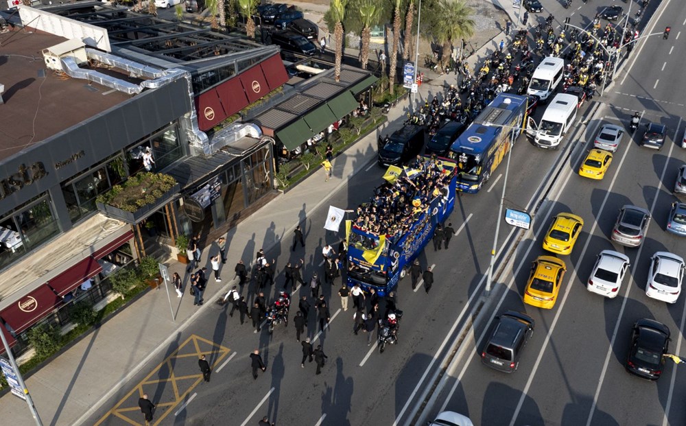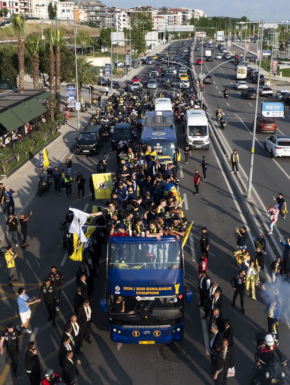 Ülker Spor ve Aktiflik Salonu’ndan üstü açık otobüsle zafer tipine başlayan sarı-lacivertliler, ikili Avrupa şampiyonluğunu simgeleyen iki yıldızlı logolarının bulunduğu bayraklarla binleri selamladı.