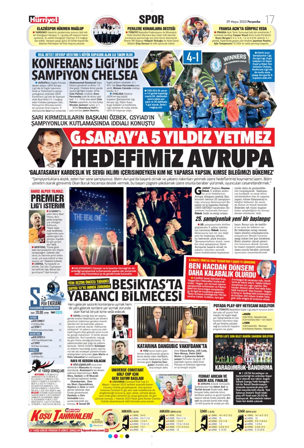 SPOR“Fenerbahçe Sane için devrede” (29 Mayıs 2025 spor manşetleri) Son güncelleme: Mayıs 29, 2025 6:39 am Yayımlandı: Mayıs 29, 2025 Paylaş 0 Dakika Okuma Paylaş Barcelona – Real Madrid El Clasico maçı ne vakit, saat kaçta ve hangi kanalda? Arda Güler oynayacak mı? Dursun Özbek 400 milyon dolarlık çılgın projeyi duyurdu Kocaelispor-Sakarya Derbisi Sonrası Flaş Açıklama: Hesap Vakti Cihan Aydın’a ağır tenkit: “Türk hakemliği için kapkara gece | Hiç utanmadı!” Trabzonspor’da genç file bekçisi ameliyat oldu Bu Makaleyi Paylaş Facebook Bağlantıyı Kopyala Yazdır Paylaş Önceki Makale Konferans Ligi’nde şampiyon Chelsea! Sonraki Makale İçişleri Bakanı Ali Yerlikaya, Karayolları Trafik Kanunu’nda yapılacak değişikliklerle ilgili kritik detayları açıkladı Yorum yapılmamış Yorum yapılmamış Bir yanıt yazın Yanıtı iptal etE-posta adresiniz yayınlanmayacak. Gerekli alanlar * ile işaretlenmişlerdirYorum *Ad * E-posta * İnternet sitesi Daha sonraki yorumlarımda kullanılması için adım, e-posta adresim ve site adresim bu tarayıcıya kaydedilsin. Takip EdinXTakip EtInstagramTakip EtTelegramTakip Et - Reklam -Son Haberler Atama ve misyondan alma kararları Resmi Gazete’de GÜNDEM Aralık 6, 2025 ASELSAN GÖKSUR’u muvaffakiyetle test etti TEKNOLOJİ Aralık 6, 2025 Adıyaman’da silahlı hengamede 2’si ağır 5 kişi yaralandı GÜNDEM Aralık 6, 2025 Galatasaray-Samsunspor maçı sonrası bir reaksiyon de Beşiktaş’tan geldi SPOR Aralık 6, 2025