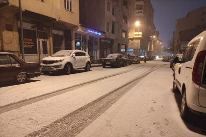 Ardahan’da akşam saatlerinde tesirli olan kar yağışıyla kent merkezi beyaza büründü.