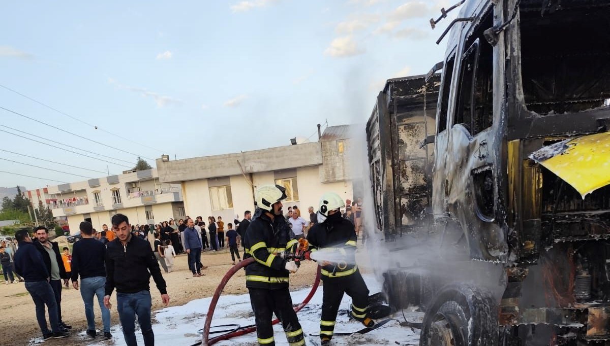 Mardin’in Artuklu ilçesine bağlı İstasyon Mahallesi’nde, evvelki akşam saatlerinde park halinde bulunan iki tırda, henüz tespit edilemeyen bir sebepten dolayı alevler yükseldi.