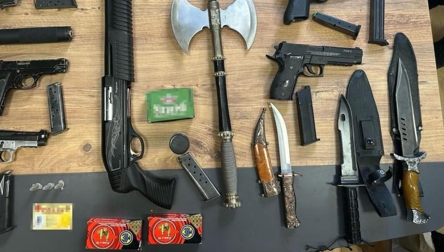 Zanlının ikametgahında yapılan aramada ise 2 adet ruhsatsız tabanca, 2 adet kurusıkı tabanca, 2 adet şarjör, 1 adet pompalı tüfek, airsoft silah, 1 adet susturucu, 2 adet bıçak, kama, balta, 126 adet çeşitli silahlara ait mühimmat, çok sayıda havalı tabanca mermisi ve bir miktar uyuşturucu madde ele geçirildi.