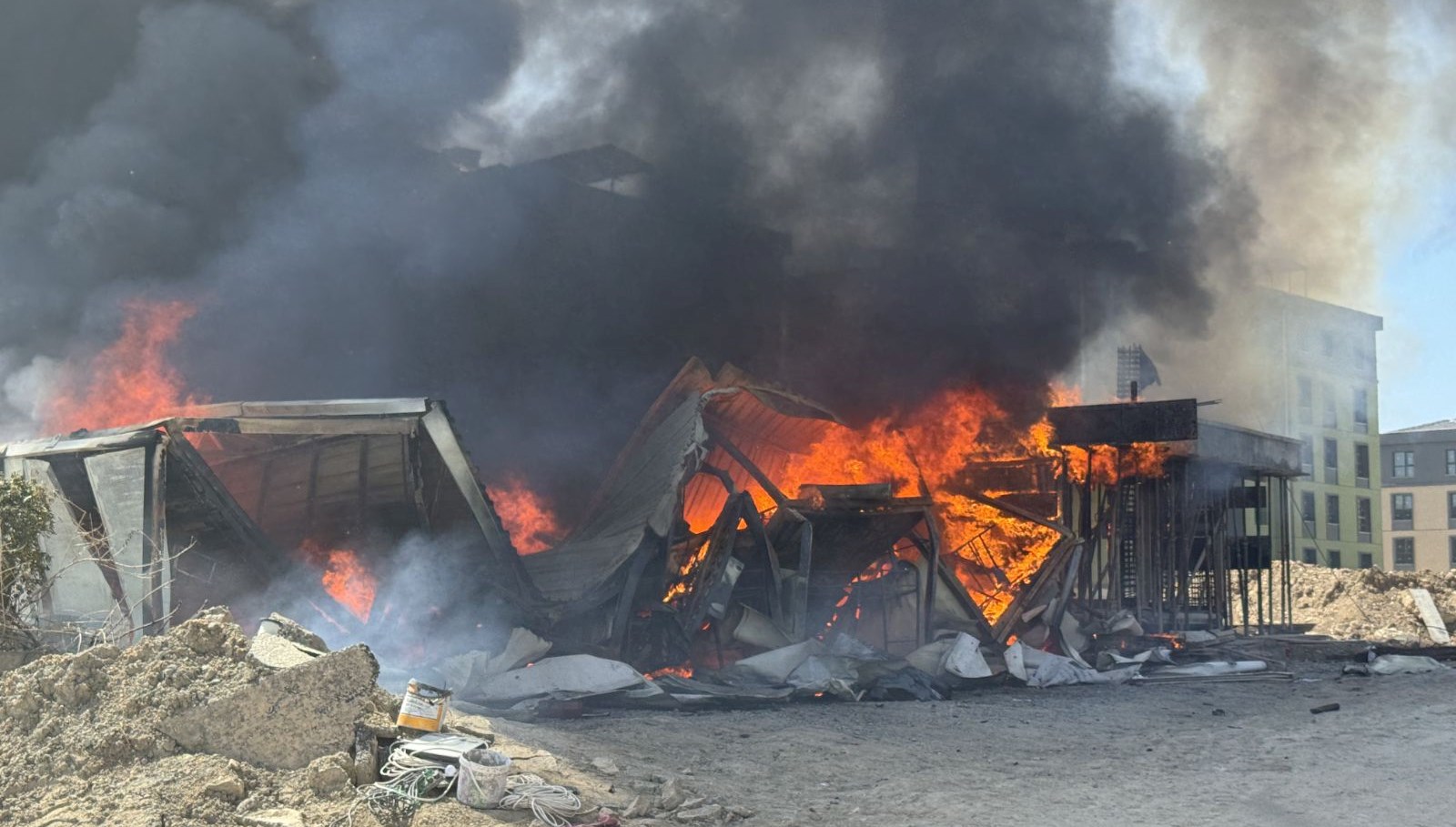 Odabaşı Mahallesi’nde konut inşaatının sürdüğü şantiyede yatakhane olarak kullanılan konteynerler, şimdi belirlenemeyen nedenle alev aldı.