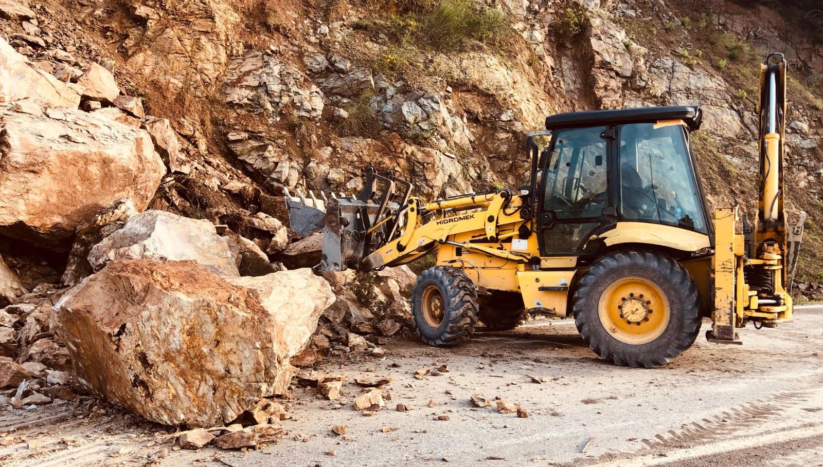 Toprak kayması sonucu karayoluna savrulan kaya modülleri nedeniyle yol bir müddet trafiğe kapandı.