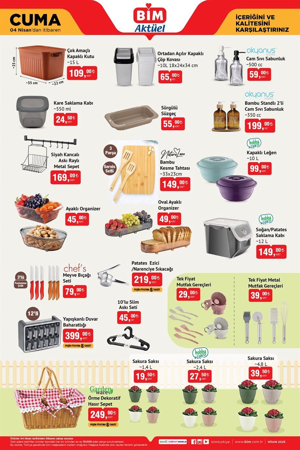 BİM, Nisan ayının ilk günlerinde müşterilerine birbirinden ilgi çekici fırsatlarla dolu yeni aktüel ürünler kataloğunu sunuyor. 1 ile 4 Nisan tarihleri arasında geçerli olacak indirim fırsatlarında; konut ihtiyaçlarından teknolojik aletlere, giyimden hayvan dostlarımızın gereksinimlerine kadar birçok alanda uygun fiyatlar bulunuyor.