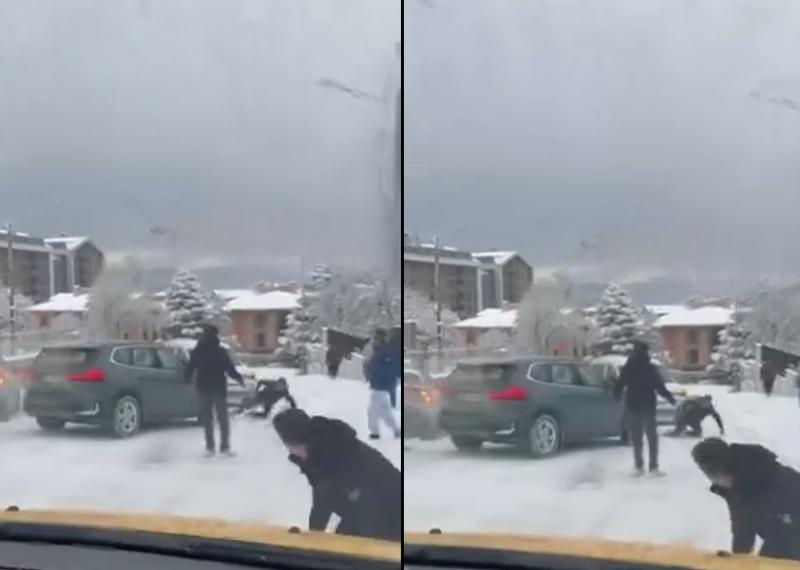 Yoğun kar yağışında denetimden çıktı, araba kayarak vatandaşların ortasına daldı.