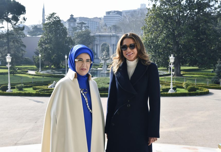 Emine Erdoğan, Kraliçe Al Abdullah’ı Dolmabahçe Sarayı’nın Muayede Salonu girişinde içtenlikle karşıladı.