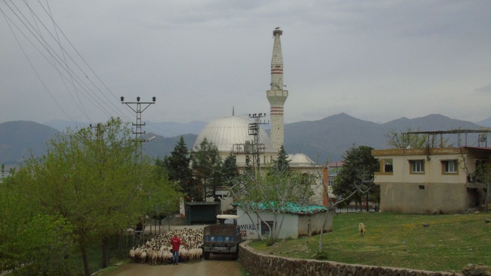 Mahalle ahalisinden Abdulkadir Karayel, basın mensuplarına, 6 Şubat’taki sarsıntılarda camiye ait minarenin aleminin yere düştüğünü ve bölgeye gelen leyleklerden bir tanesinin buraya yuva yaptığını ifade etti.