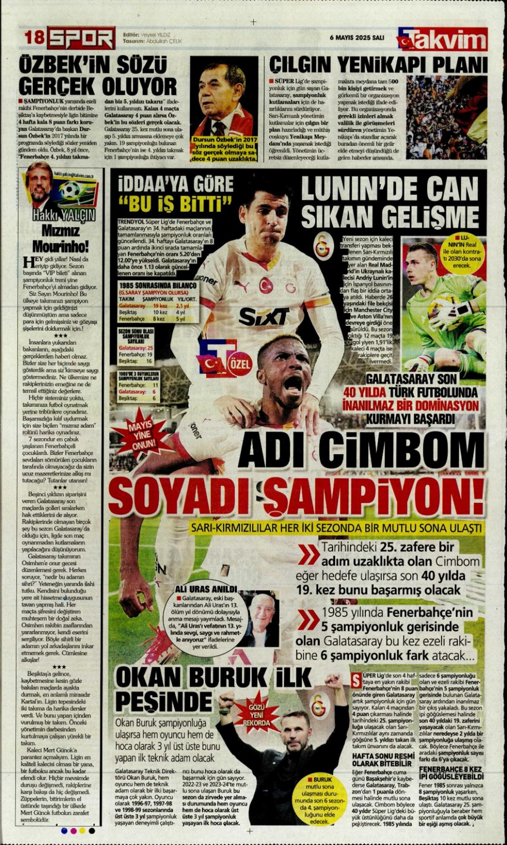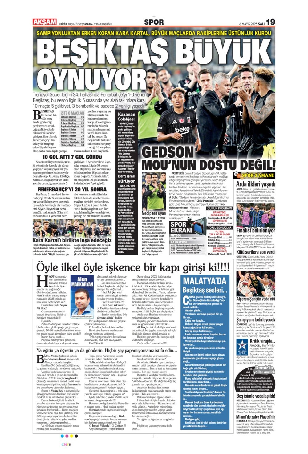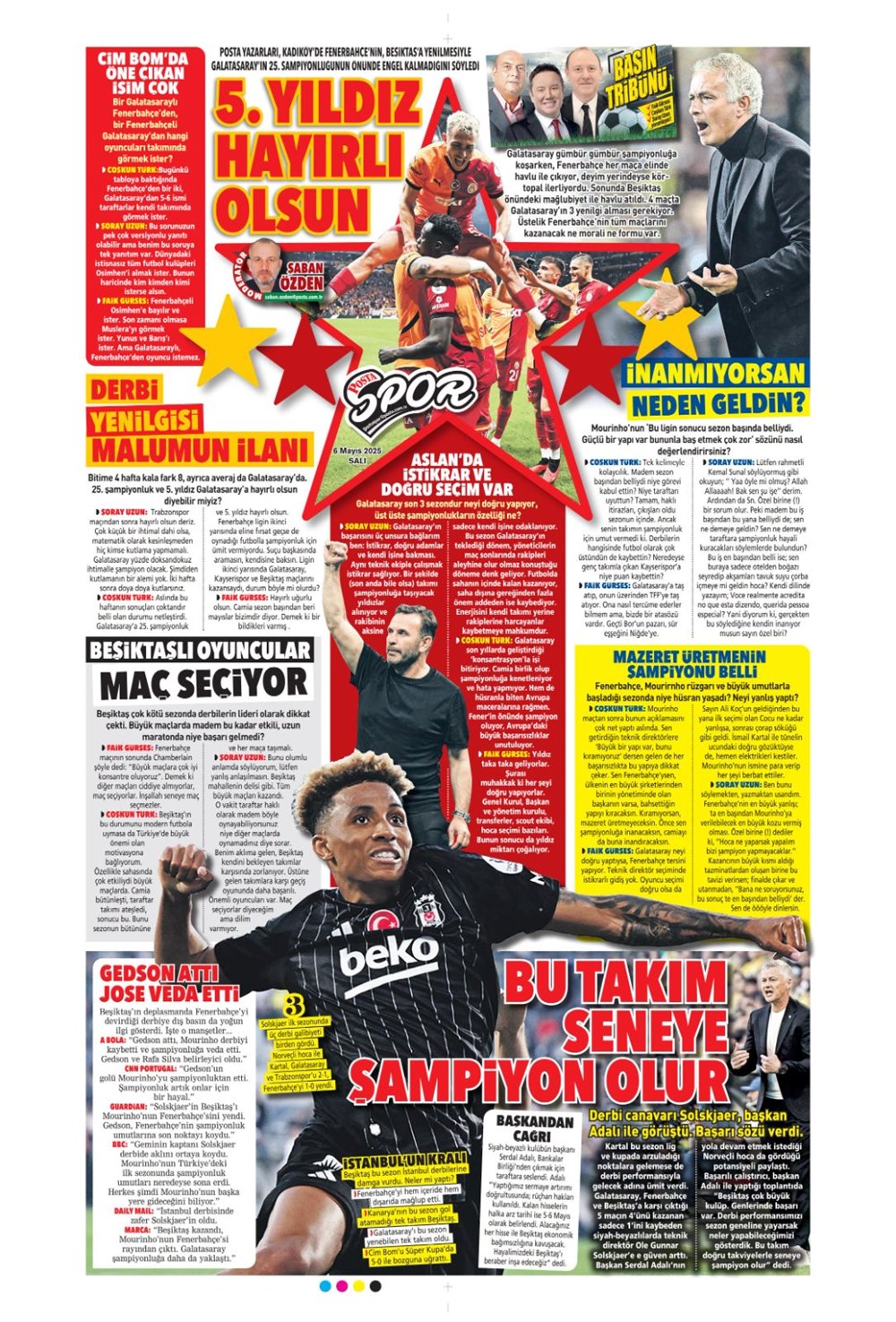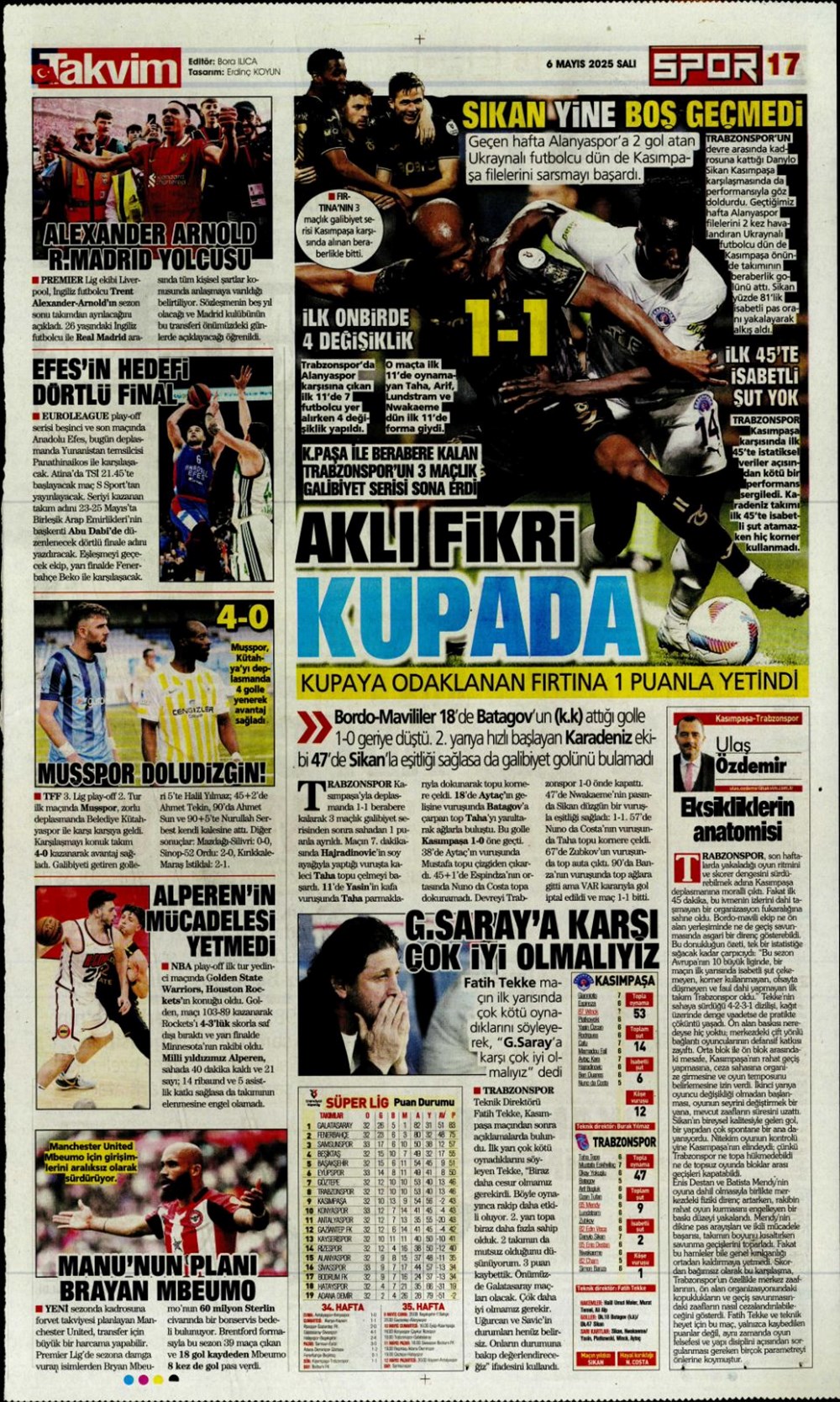 SPOR“Aslan’dan üçlü harekat” (6 Mayıs 2025 spor manşetleri) Son güncelleme: Mayıs 6, 2025 6:19 am Yayımlandı: Mayıs 6, 2025 Paylaş 0 Dakika Okuma Paylaş Suriye’den Flaş İddia: PKK/YPG, Halep’i Terk Edip Suriye İçişleri’ne mi Katılıyor? Final Bileti İçin Nefesler Tutuldu: Galatasaray-ÇBK Mersin Derbisi Başlıyor! Fenerbahçe’den sponsorluk argümanlarına cevap MotoGP San Marino’da kazanan Marc Marquez Türkiye, UEFA’da 12 şahısla temsil hakkı kazandı Bu Makaleyi Paylaş Facebook Bağlantıyı Kopyala Yazdır Paylaş Önceki Makale Edirne’de Kakava ateşi yakıldı Sonraki Makale Çanakkale’de traktör faciası! 80 yaşındaki çiftçi hayatını kaybetti Yorum yapılmamış Yorum yapılmamış Bir yanıt yazın Yanıtı iptal etE-posta adresiniz yayınlanmayacak. Gerekli alanlar * ile işaretlenmişlerdirYorum *Ad * E-posta * İnternet sitesi Daha sonraki yorumlarımda kullanılması için adım, e-posta adresim ve site adresim bu tarayıcıya kaydedilsin. Takip EdinXTakip EtInstagramTakip EtTelegramTakip Et - Reklam -Son Haberler Ankara’da kan donduran olay. Annesini, kızını ve eşini öldürüp intihar etti GÜNDEM Şubat 10, 2026 Dereye uçan arabadaki 2 kız kardeş hayatını kaybetti. Kaçan şoför yakalandı GÜNDEM Şubat 9, 2026 Rap dünyasında “Malatyalıyım” çıkışı: Uzi’den “Şeytan” iddialarına sert tepki! MAGAZİN Şubat 9, 2026 Gülşen’den Şaşırtan “Soyadı” Hamlesi: Tam 10 Yıl Sonra Bir İlk! MAGAZİN Şubat 9, 2026