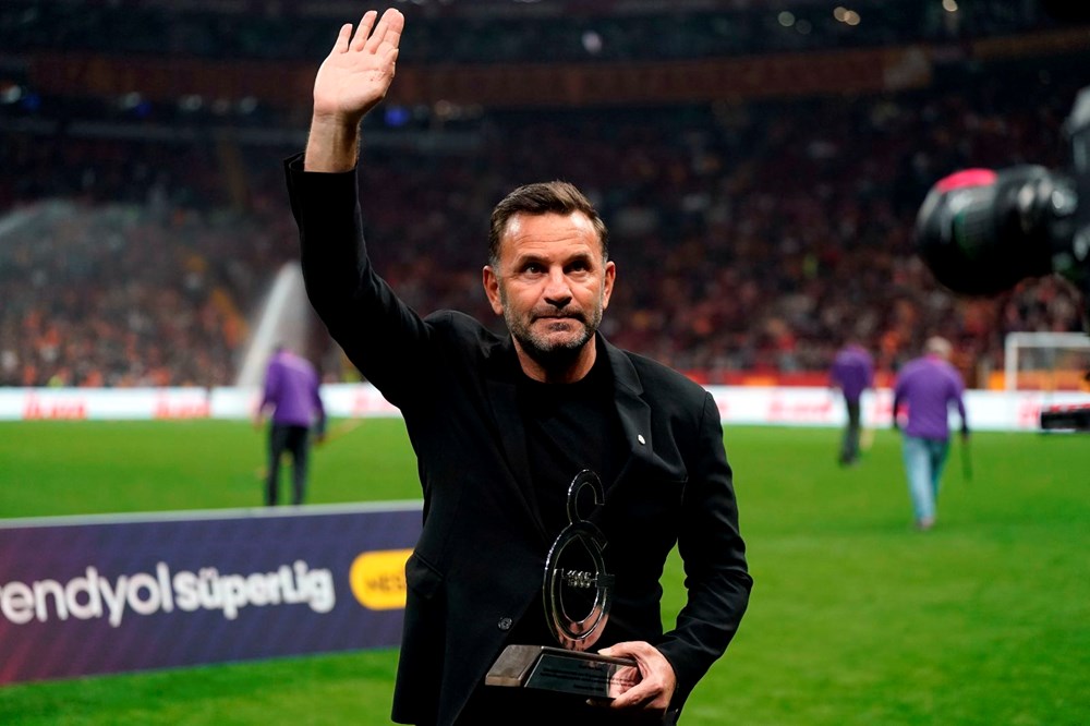 Galatasaray’ın başında Süper Lig’de 100 maça çıkan Okan Buruk’a plaket verildi.