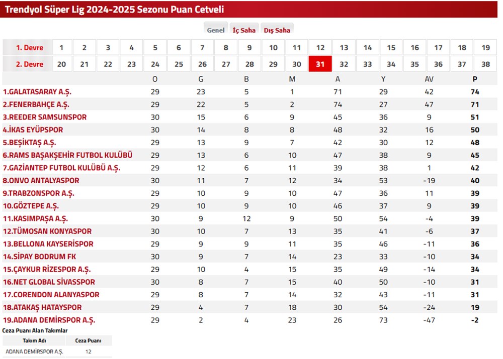 Süper Lig’de puan durumu merak konusu oldu. Deplasmanda Reeder Samsunspor’u 2-0 mağlup eden önder Galatasaray, puanını 74’e çıkardı. Fenerbahçe ise konuk olduğu Net Küresel Sivasspor’u 3-1 yenerek puanını 71’e yükseltti ve tepe takibini devam ettirdi.