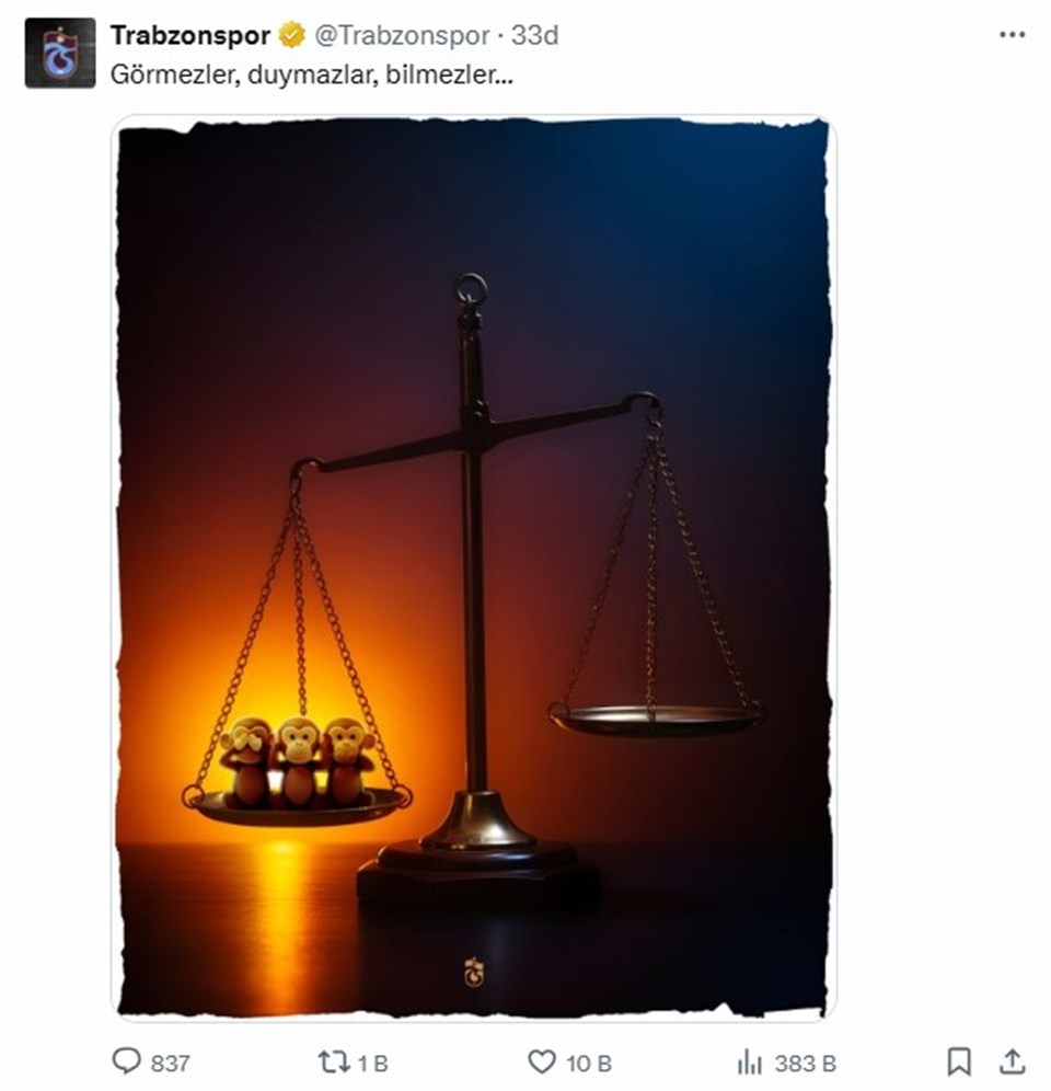Kulübün sosyal medya hesabından yapılan paylaşımda, “Görmezden gelirler, duymazdan gelirler, görmezden gelirler…” ifadeleri ve dengesi bozulmuş bir terazi ile ‘3 maymun’ emojisine yer verildi.